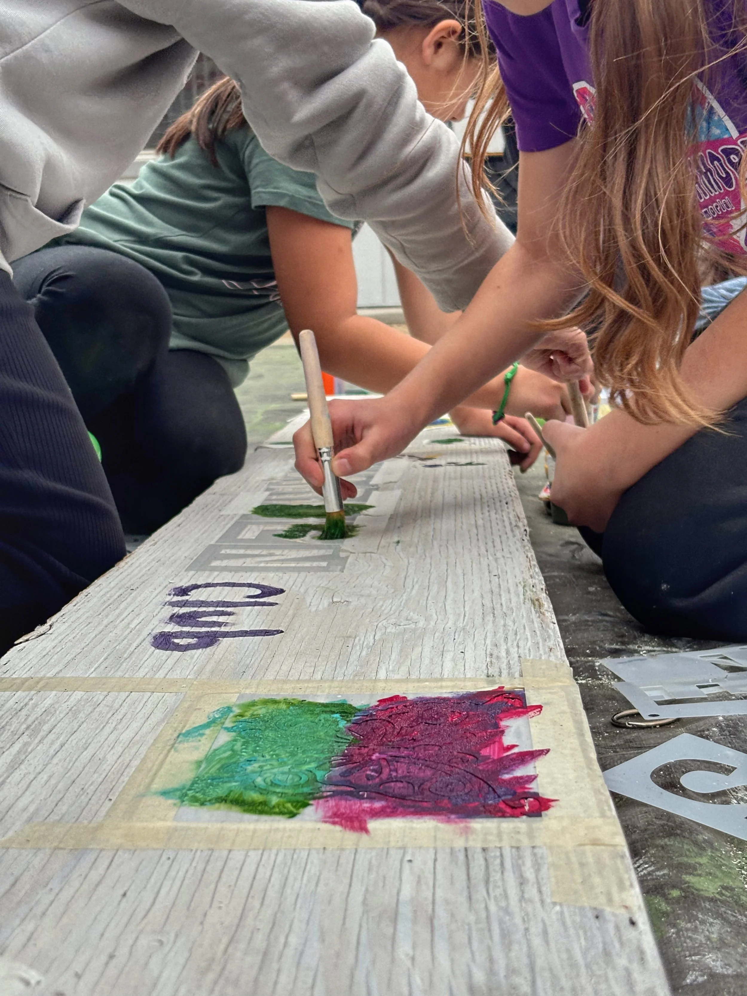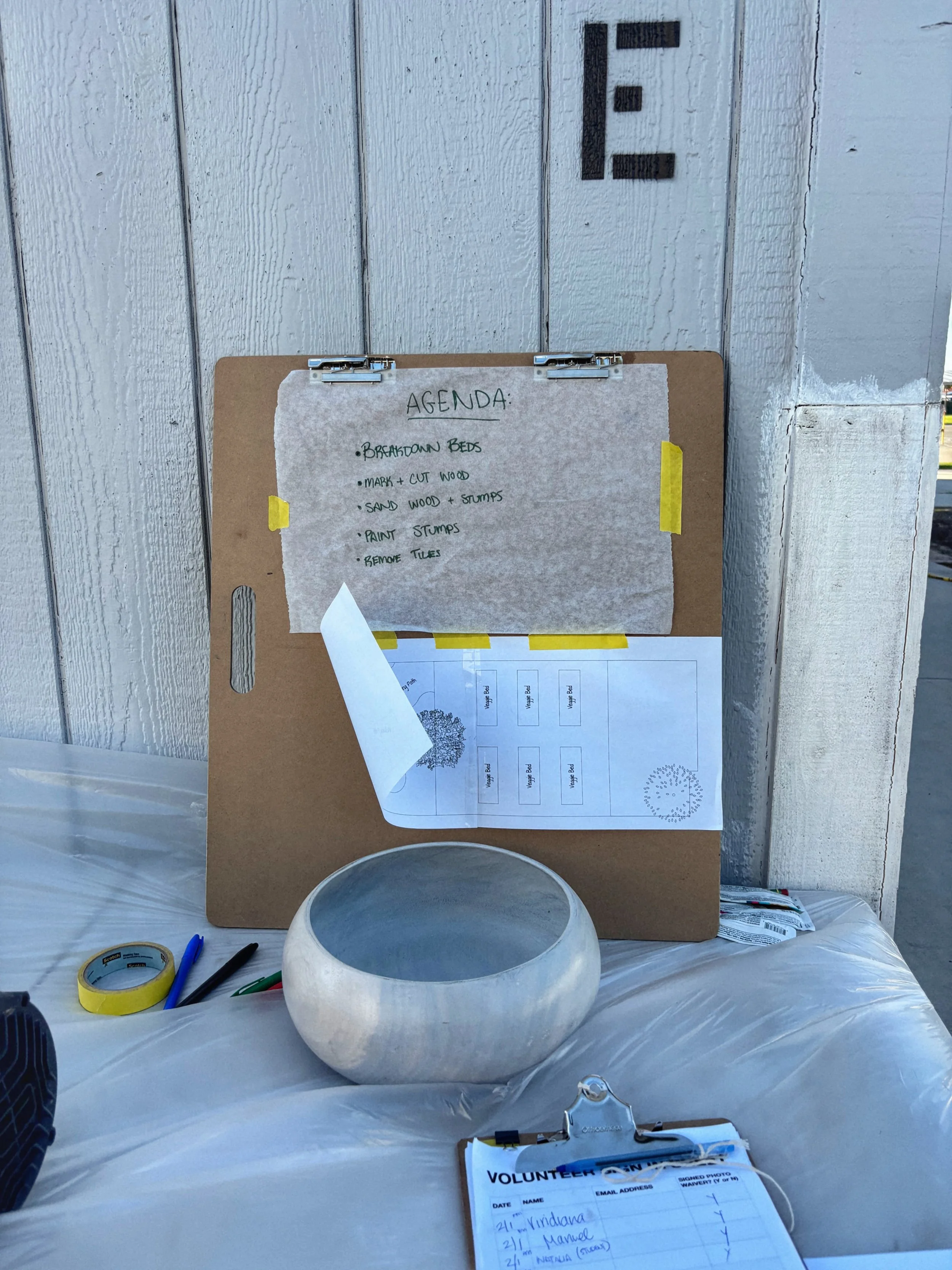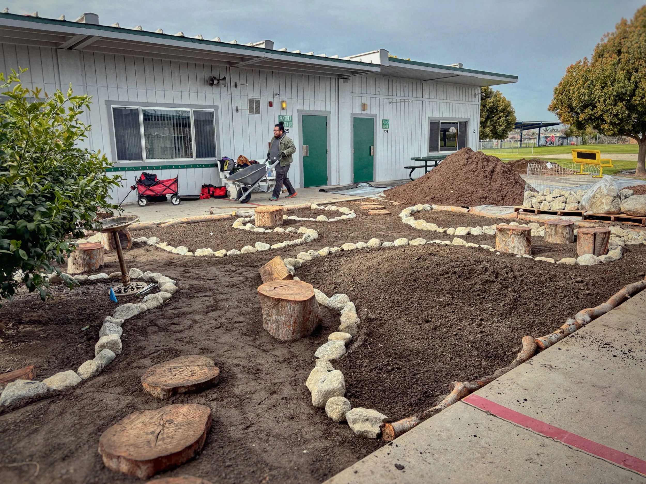 Reclaimed wood edging and stumps provided by Sustainable Labor Alliance